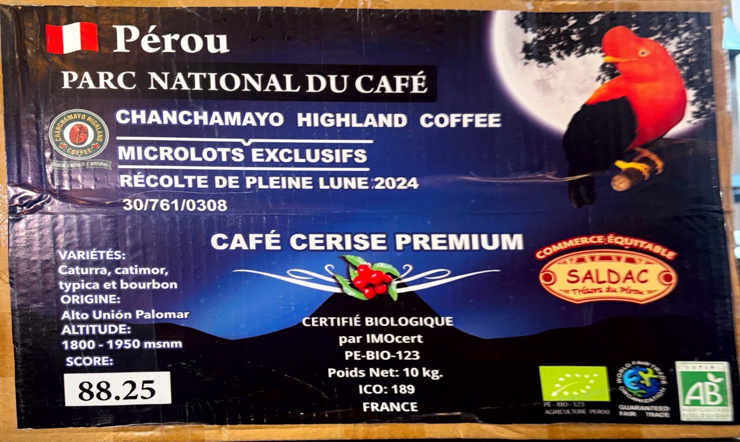 Certaines familles de la Coopérative Highland Coffee du village de Alto Palomar, dans le Parc National du Café de la province de Junin, récolte ce café dans les 24 heures suivant la Pleine Lune et uniquement lorsque il y a assez de cerises mures. Elles sont alors gorgées de sève et ont donc un niveau de sucres et d’acides gras remarquable.